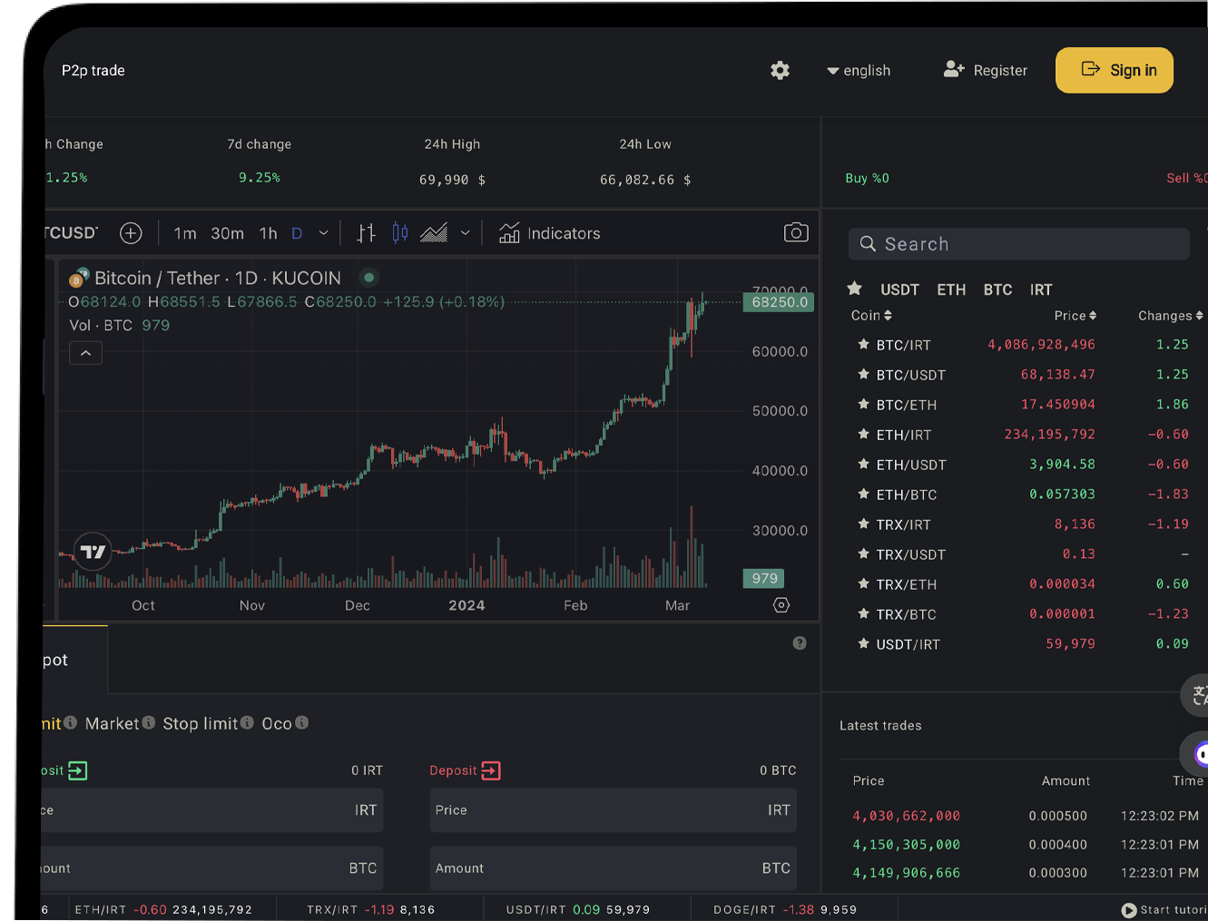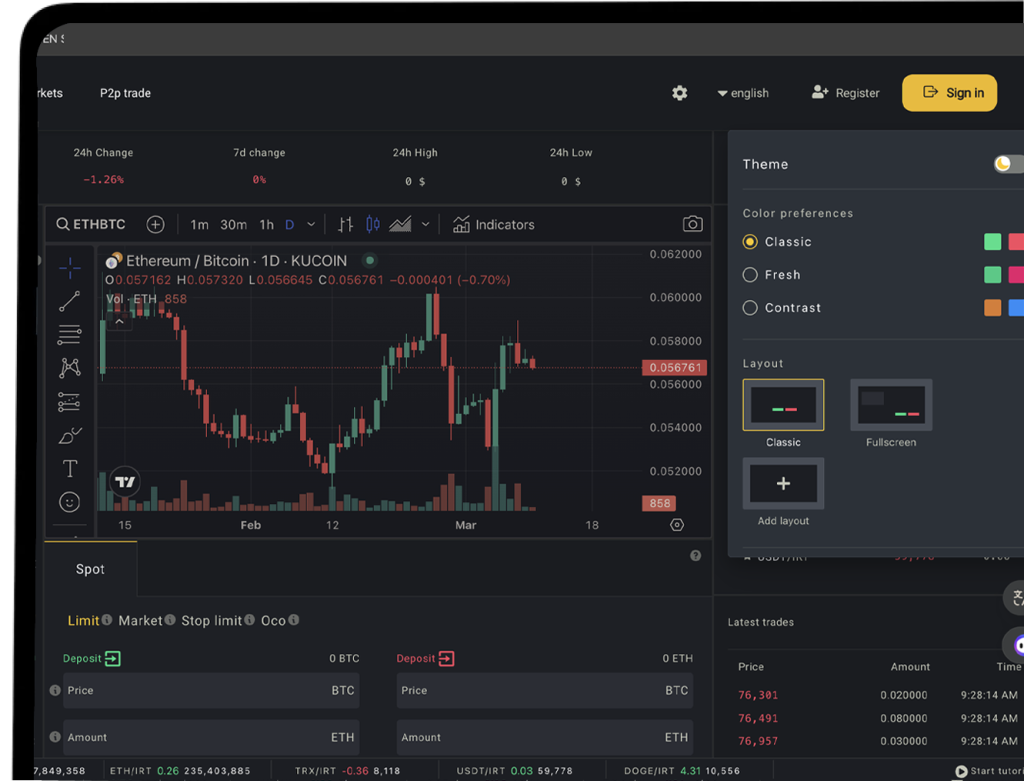 The platform supports various order types, including Limit, Market, Stop-Limit, and OCO. It also offers a draggable and user-customizable market UI, allowing users to tailor their Buy/Sell experience.